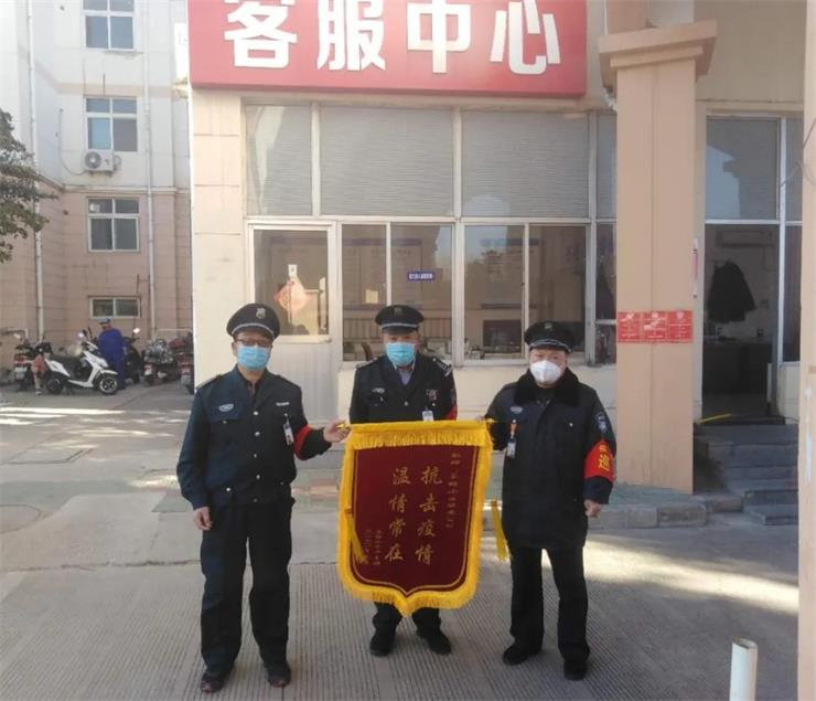 3月19日,在苍梧小区客服中心上演了温馨感人的一幕,家住小区41号楼的业主王女士将一面写着“抗击疫情,温情常在”的锦旗送到了苍梧小区保安人员的手中,对他们之前见义勇为、真诚相助自己表示感谢。