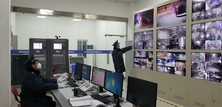 今夜是黄耀中和徐长柱值班,他们坐着屏幕前,透过监控查看小区各个角落,避免疫情期间任何可疑人员进入小区,保障小区安全。