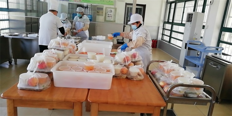 临近中午,苍梧物业在管的城管局项目处食堂里,热腾腾的午餐已经出锅,和以往不同的是,在疫情特殊时期,物业工作人员将蔬菜、水果、米饭分别打包,再送给用餐人员,通过打包分餐,避免堂食的方法,有效保障用餐人员健康与安全。